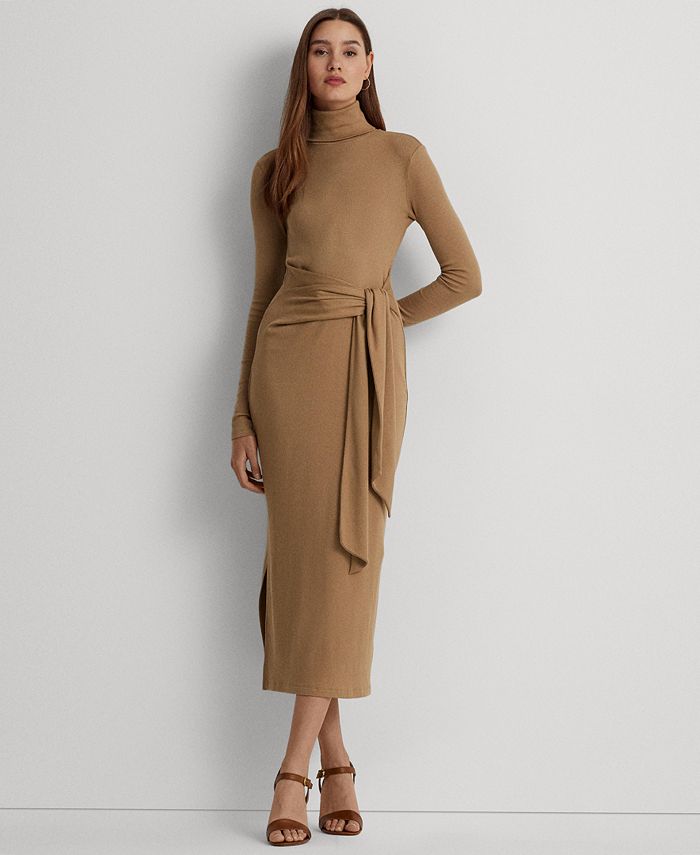 Rib-knit with a soft stretch-cotton blend, this turtleneck sweater dress from Lauren Ralph Lauren is cut for a slim-fitting silhouette and a calf-grazing midi length. A tie-front design at the waist adds contemporary flare to this refined piece, while slits at the hem afford ease of movement.